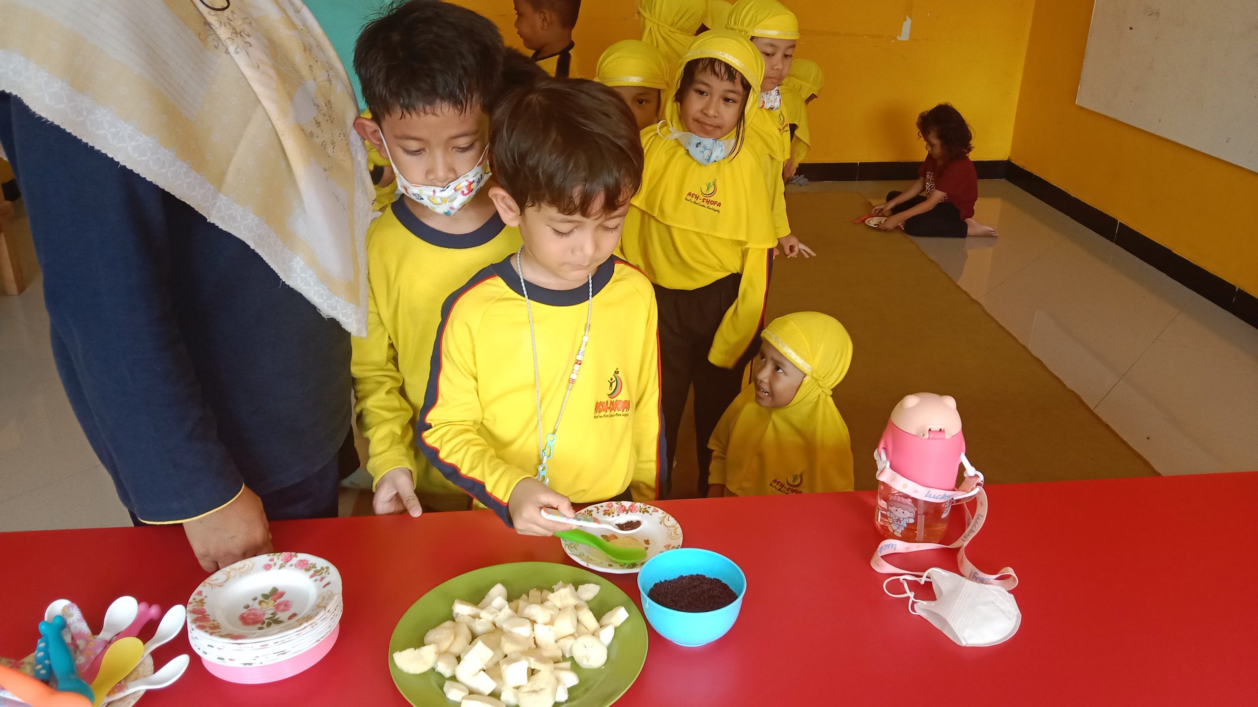 Pembelajaran di Sentra Masak (Membuat Singkong rebus tabur coklat) 2